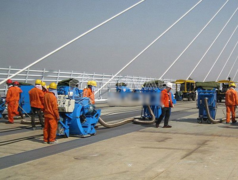路面拋丸機(jī)能夠一次將混凝土的表面浮漿、雜質(zhì)清理清除,并且可以對混凝土的表面進(jìn)行打毛處理,使其表面均勻粗糙,大大提高了防水層和混凝土基層的黏著強(qiáng)度,以便防水層和橋面更好的結(jié)合,同時(shí)也能夠?qū)⒒炷恋牧鸭y充分暴露出來,起到防患于未然的作用。