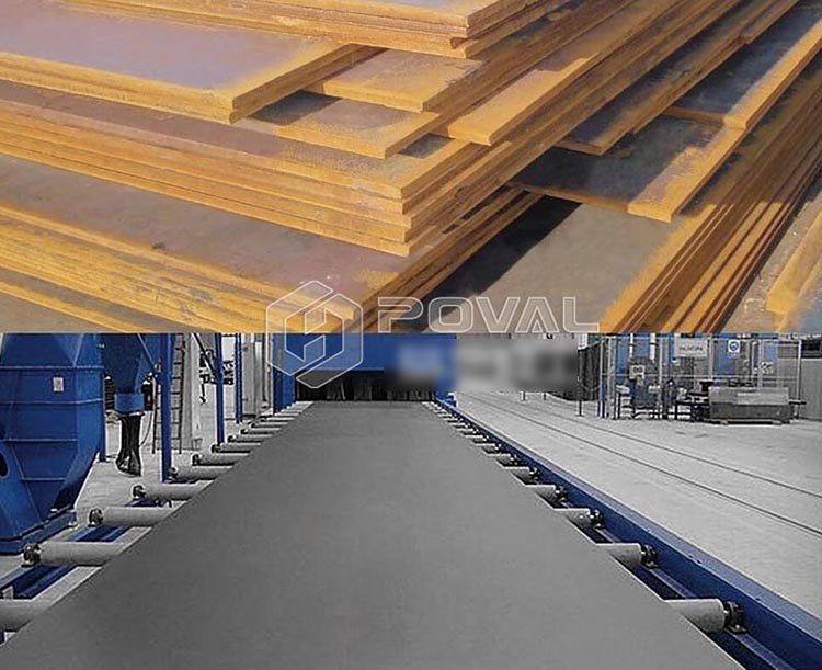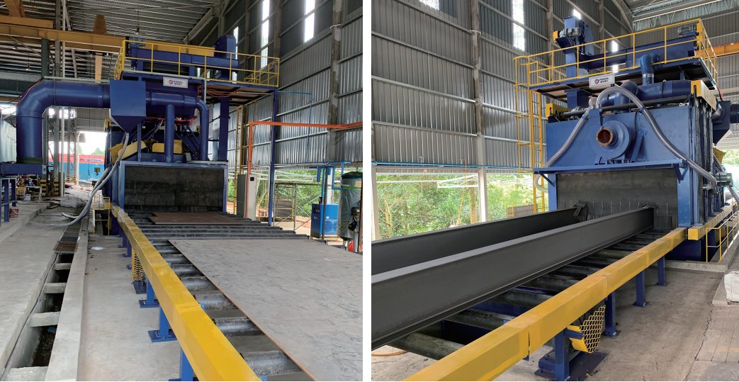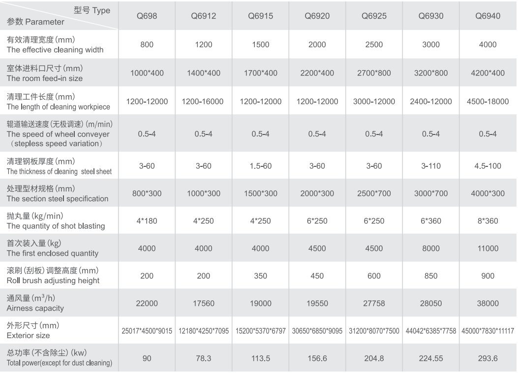 Q69系列鋼板型材拋丸機(jī)是一種鋼板型材通過式自動(dòng)拋丸清理設(shè)備。通過拋丸清理后,工件表面的氧化皮漆皮及其它雜質(zhì)均被清理掉,使工件露出金屬本色。同時(shí)通過拋丸清理還可以消除工件的內(nèi)應(yīng)力,提高工件的抗疲勞強(qiáng)度。另外,由于拋丸將工件表面雜質(zhì)清除了,并且造出了有利于涂裝的粗糙度,增強(qiáng)了噴涂時(shí)表面涂層的附著力,延長了噴涂壽命,提高了整個(gè)表面及內(nèi)在的質(zhì)量。鋼材經(jīng)過預(yù)處理可以提高機(jī)械產(chǎn)品和金屬構(gòu)件的抗腐蝕能力,提高鋼板的抗疲勞性能,延長其使用壽命;同時(shí)還可以優(yōu)化鋼材表面工藝制作狀態(tài),有利于數(shù)控切割機(jī)下料和精密落料。此外,由于加工前鋼材形狀比較規(guī)則,有利于機(jī)械除銹和自動(dòng)化噴漆,因此采用鋼材預(yù)處理可大大提高清理工作的效率,減輕清理工作的勞動(dòng)強(qiáng)度和對環(huán)境的污染。